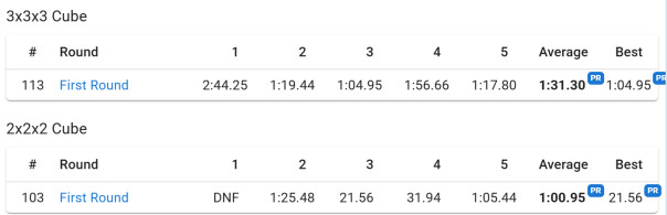 Voor de 3x3x3 kubus was mijn snelste tijd 1:04.95 en de gemiddelde tijd 1:31.30 minuten.