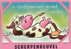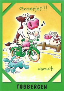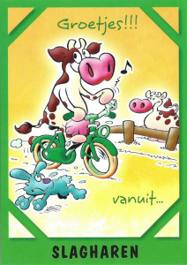 5 kaarten met koeien uit uit de serie Beestenboel met een bruin-witte koe,