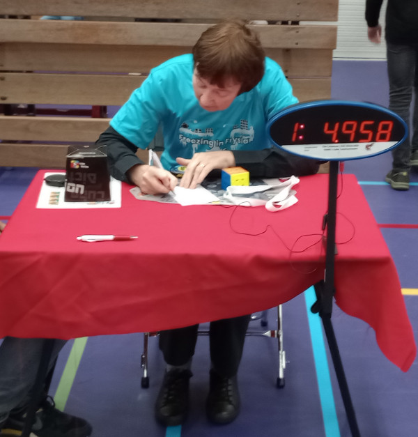 ze kregen alle 3 tijdstraf van 2 seconde. - bij 1 kubist was de kubus 1.5 kwartslag verdraaid, dat werd een DNF (Did Not Finish)