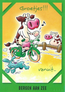 5 kaarten met koeien uit uit de serie Beestenboel met een bruin-witte koe,